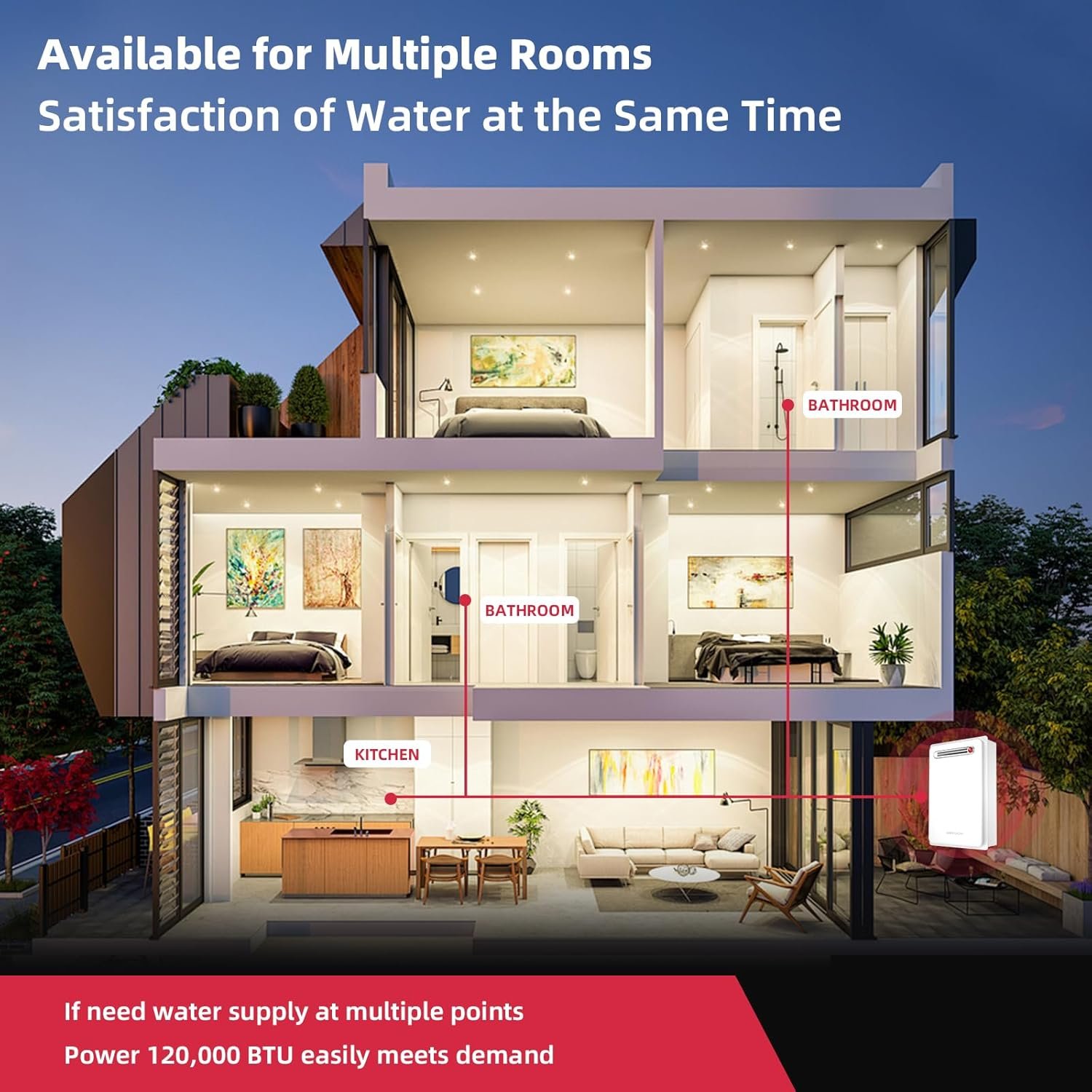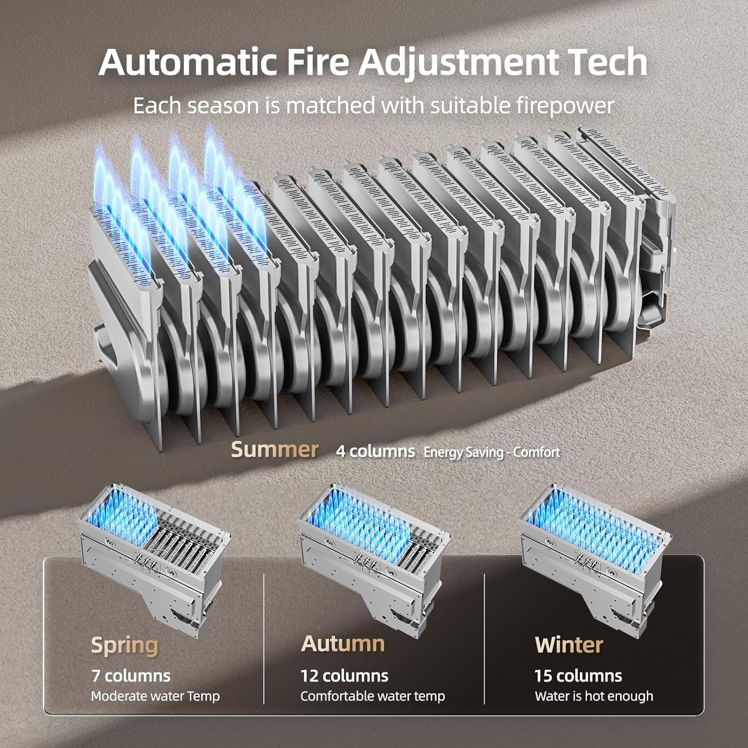 This Mizudo tankless water heater is designed for outdoor installation. Powered by propane, it provides continuous hot water to multiple points through your home. The heat exchanger quickly heats the water to a maximum of 149°F, eliminating the wait for water to heat up. The bottom built-in forced DC fan eliminates the influence of external wind, ensuring stable combustion, safety, energy efficiency, and no pollution.